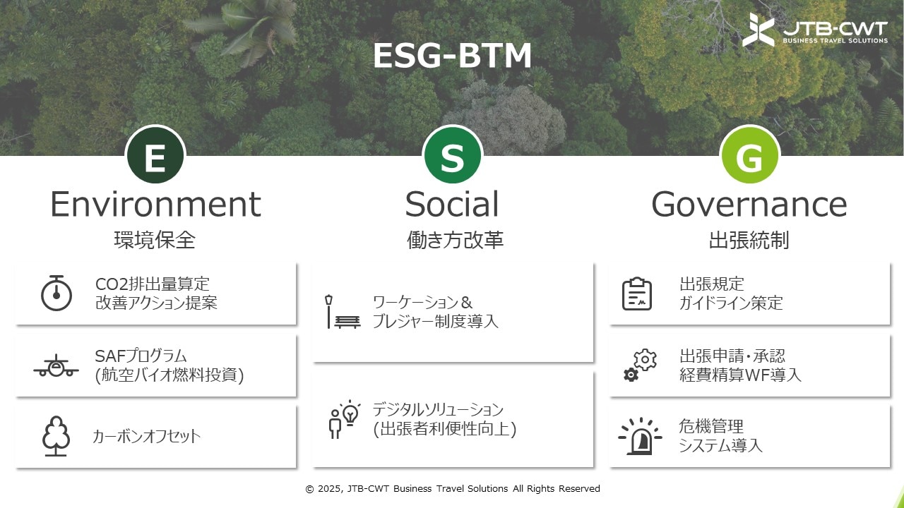 こうした課題に対応するため、JTBビジネストラベルソリューションズでは、ESGの観点を取り入れた新しい出張管理「ESG-BTM」をご提案しています。