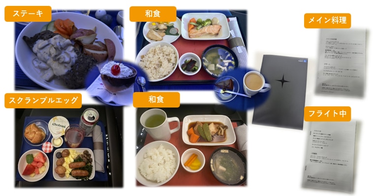 ・機内食:コース料理。和食または洋食から選べます。事前予約(搭乗の5日前から24時間前まで)も可能