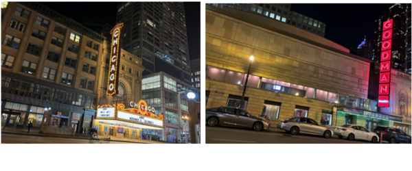 ・シカゴ劇場:シカゴは、ブロードウェイに次ぐ規模を誇る、全米屈指の劇場都市です。100を超える劇場があり、毎晩のようにミュージカルや演劇が上演されています。写真は最も有名なChicago Theatreと、シカゴで最も歴史のある劇場の一つであるGoodman Theatreです。