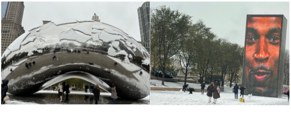 ・Millenium Park:言わずと知れたシカゴのシンボル、「ザ・ビーン」がある巨大公園です。 青空を映す巨大な豆型彫刻は、写真映えも抜群です!私たちが訪問した11月はちょうど初雪が降っていて、ザ・ビーンに積もった雪がまるで地球儀みたいで素敵でした。
