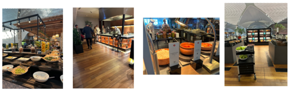 ①前菜(ワゴンサービス) ②メイン料理(左:ステーキ 右:パスタ)