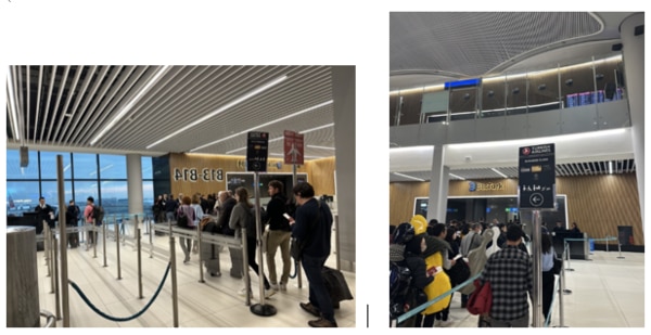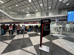 なし。エコノミークラスとビジネスで列が分かれており、エコノミークラスは込み合っている印