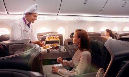長距離線のビジネスクラスでは、客室乗務員の資格を持ったシェフが搭乗して、料理を提供してくれる「フライングシェフ」という他社にはないサービスがございます。