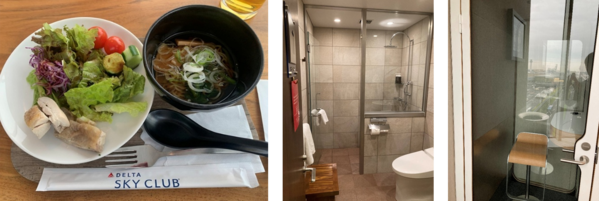 出国手続き後、飛行機が出発するまでに2時間ほどあったため、今回はDelta SKY CLUB(デルタスカイクラブ)で時間を過ごしました。Delta SKY CLUBでは、旬の食材を使った世界各国の料理や日本食をビュッフェスタイルで楽しめるほか、その場で調理するヌードルバー、Wi-fi、電源付きの座席、シャワールームも設置されており、出発までの間を快適に過ごすことができます。また、ビジネスパーソン向けにはミーティングルームも用意されているためWEB会議等を実施することが可能です。