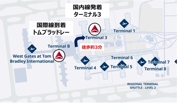 デルタ航空を利用する場合、ロサンゼルス空港での乗り継ぎは、到着ターミナルBからターミナル3までの移動が徒歩3~5分程度のためとてもスムーズに乗り換えができる点です。