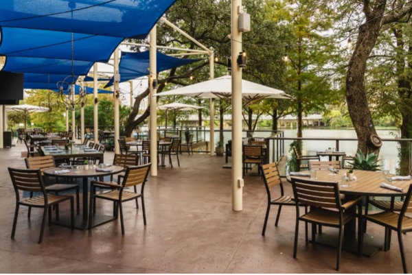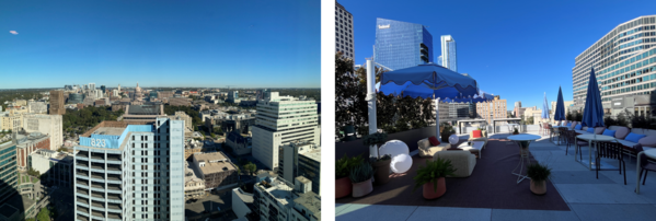 テキサス州議事堂やテキサス大学などを一望できる大きな窓(画像左)やテキサス州議事堂に繋がるCongress Ave.に面している開放的なテラス(画像右)がおすすめです。