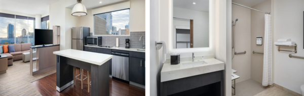 バリアフリー対応しており、車いすや介助犬が通れる広い出入口や低い高さの家具(ベッド・鏡・カウンター)、車いすの方でも調理器具が使用できるような高さへ設置するなど細かな配慮があります。キッチンには冷蔵庫や電子レンジ、コーヒーメーカー、食器洗浄機などが設置されており、滞在日数に合わせて冷蔵庫のサイズや食器洗浄機のリクエストをすることが可能です。
