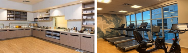 宿泊者はビュッフェ形式の朝食でテイクアウトも可能です。24時間利用可能が可能なジムや温水プール、ウォーターサーバーも完備しています。