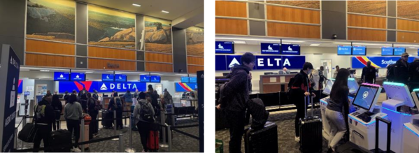 デルタ航空のチェックインの後にFace Expressの機械で登録を行いました。Face Expressは、搭乗券・パスポートの読み込み・お客様の顔写真の撮影を行い、保安検査場において優先レーンを使っての手続きによって15分ほどで手続きが完了すると共に、コンタクトレスによって接触リスクが軽減され、感染症対策にも有効です。