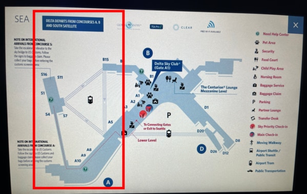 シアトル・タコマ空港は日本から最も近い西海岸のハブ空港です。今回利用したデルタ航空は、空港の中でもA・B・Sゲート(赤枠内)を地下鉄で移動できるため、乗り継ぎがとても便利です。