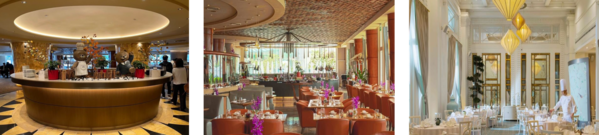 ホテル内には宴会場としてバルモラルホールとスコッツスイートがあります。バルモラルホールは、オーチャードロードで最も人気のあるホールの1つで、最大110名まで収容可能です。また、スコッツスイートは、結婚式に最適な会場として紹介されています。さらに、1階のカローセル・ビュッフェレストランには、8700平方フィートを超えるダイニングスペースと、2つのカスタマイズ可能なプライベートルームがあり、レセプションにも利用できます。