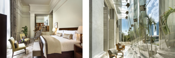 フラートンホテルの最上級カテゴリーであるプレジデンシャルスイートは、約201㎡(2,169sqf)の広さを誇り、かつてシンガポールクラブのカードルームとして使われていた歴史ある空間を贅沢に改装したお部屋です。約6メートルのドリス式円柱が並ぶ壮大なガラス張りのベランダやプライベートエレベーターも用意されており、VIPに方にもご満足いただけるお部屋になっております。