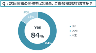 また、同僚・知人への推奨度も全員が「薦めたい」と回答し、84%の参加者が次回開催を検討すると回答するなど、非常に高い評価をいただきました(n=19)。
