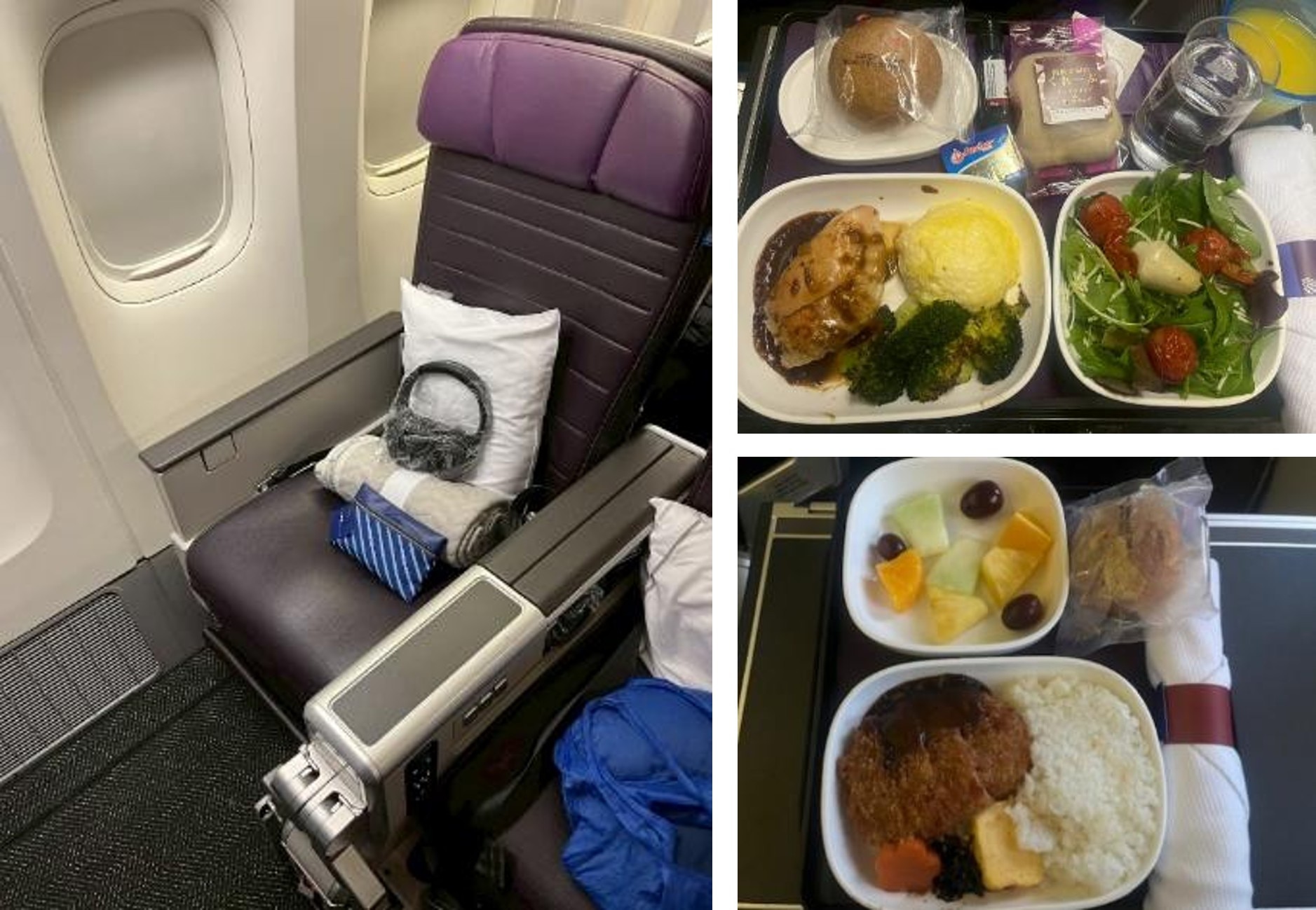 機内食: お食事はメニューから選択可能で、洋食が3種類、和食が1種類用意されていました。 機内が消灯した後も、お好みのタイミングで軽食やスナックを注文できるサービスがあります。 特に、デザートのアイスクリームサンデーは、多彩なトッピングが用意されており、絶品でした。