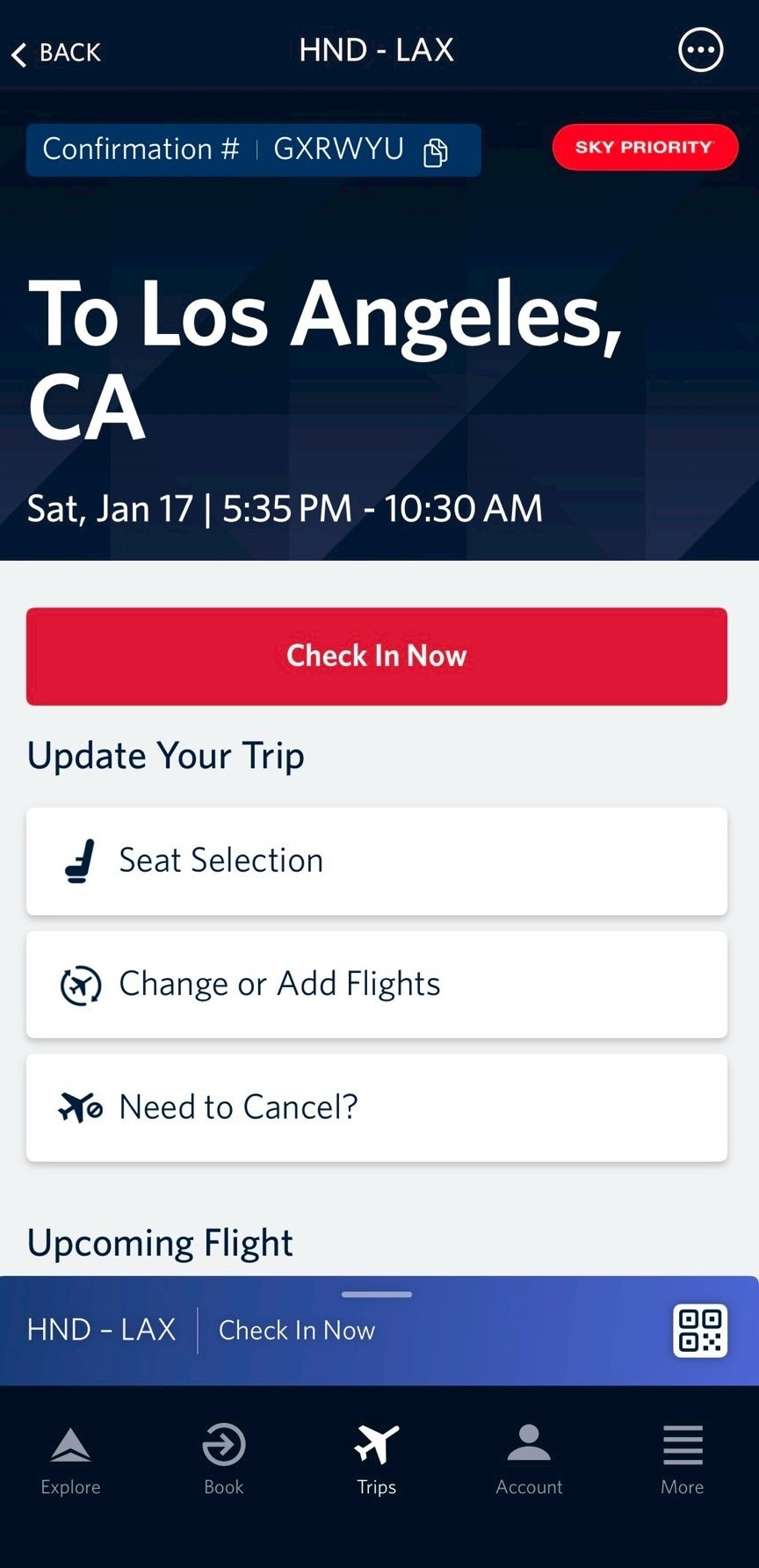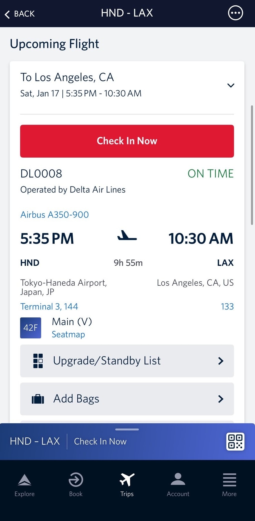 復路:DL007 LAX(10:10)-HND(15:05)プレミアムエコノミークラス・エコノミークラス