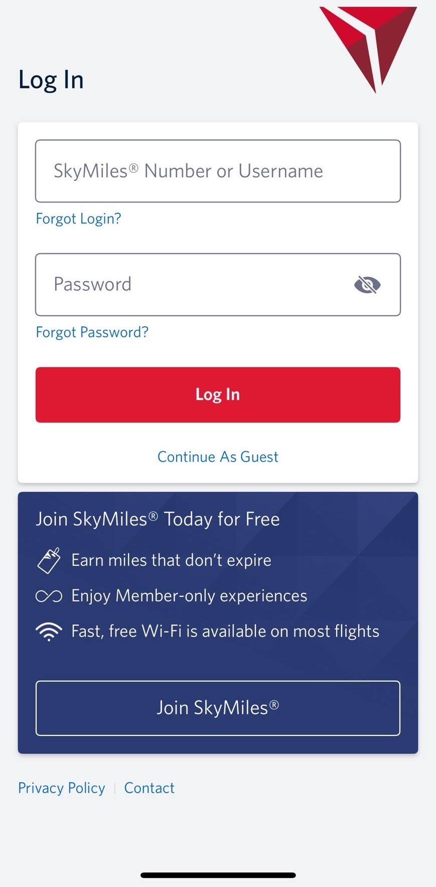 スカイマイル会員の方は会員番号でログインすることができ、会員登録していない方でも「Continue As Guest」を押下し、お名前と予約番号を入力することでログインすることができます。