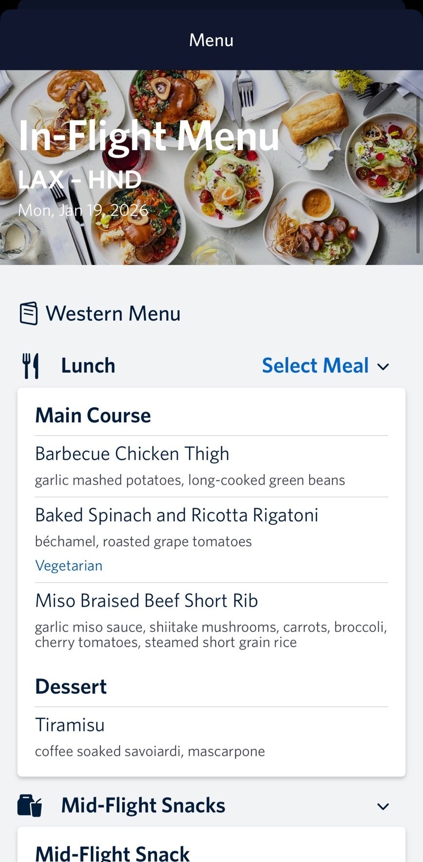 機内食事前予約は、デルタ・ワン、デルタ・プレミアムセレクト、デルタ・コンフォートで出発7日前から24時間まで利用可能です。