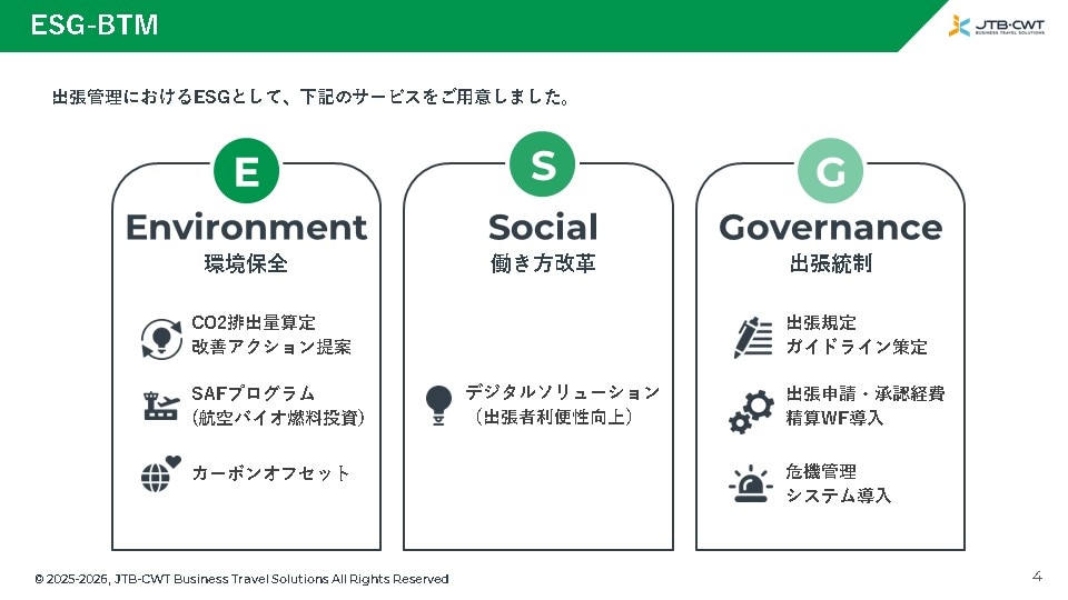 本資料では、CO2排出量の算定などをはじめとした、出張管理(BTM)におけるESGソリューションをご紹介します。